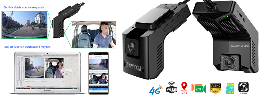 Với camera hành trình online Navicom J400N bạn có thể xem truyền hình trực tuyến hình ảnh phía trước và phía trong cabin xe qua kết nối mạng 3G/4G.