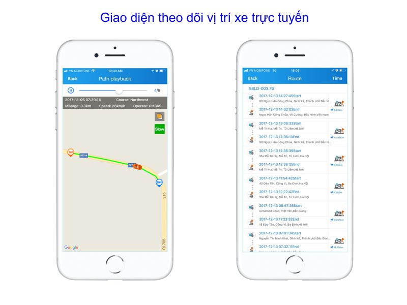 Theo dõi phương tiện với đầy đủ các thông tin về vị trí, lộ trình, vận tốc, trạng thái bật tắt máy theo thời gian thực trên ứng dụng di động