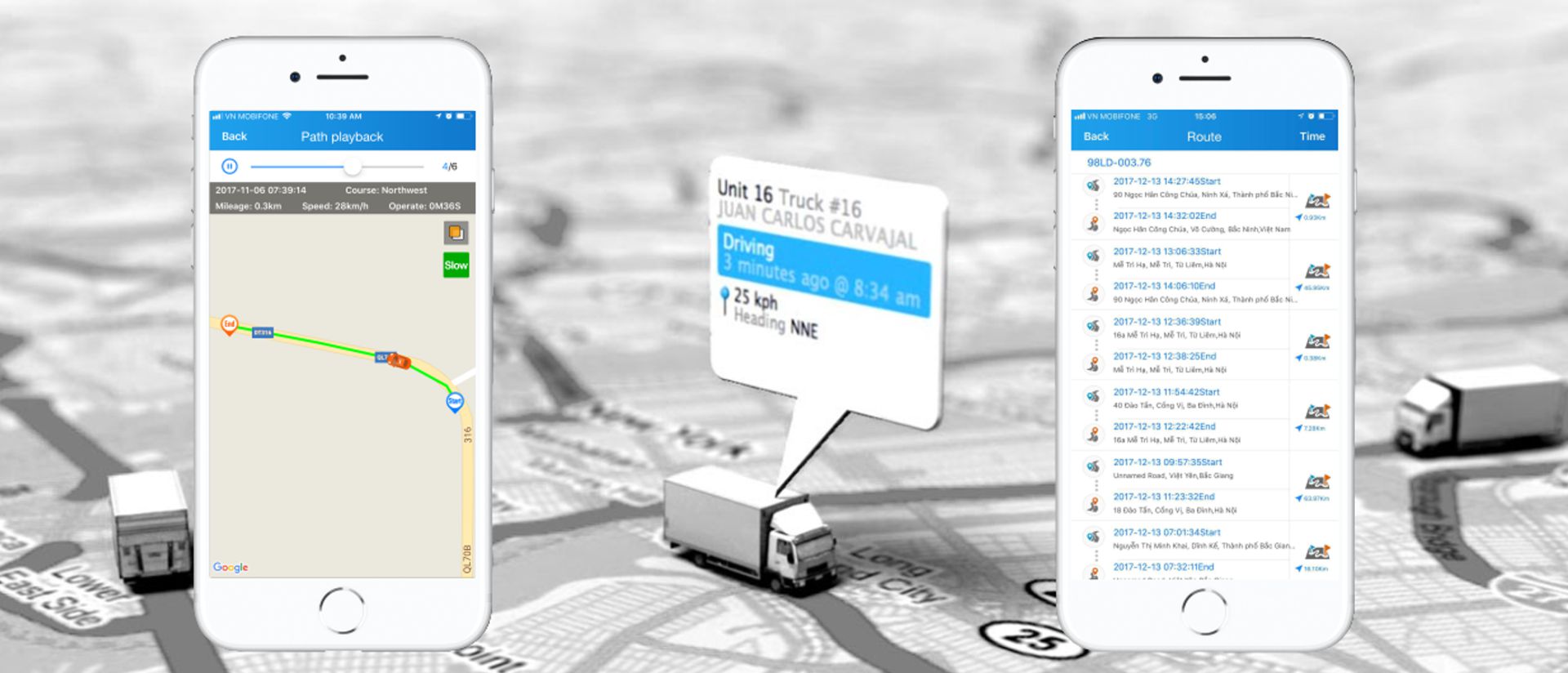 Theo dõi phương tiện với đầy đủ các thông tin về vị trí, lộ trình, vận tốc, trạng thái bật tắt máy theo thời gian thực trên smart phone và máy tính