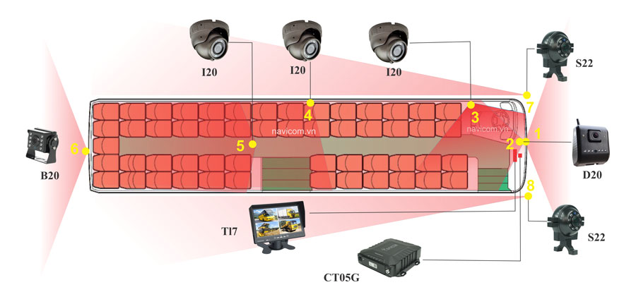 Hệ thống 8 camera giám sát hợp chuẩn NGHỊ ĐỊNH 10 cho xe khách - bus trên 30 chỗ ngồi Navicom HT08-ND10 gồm: